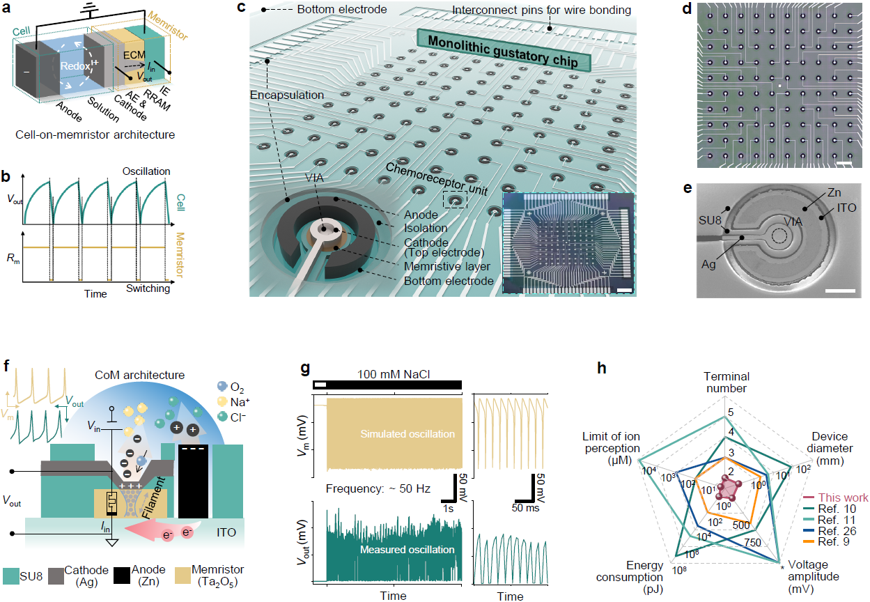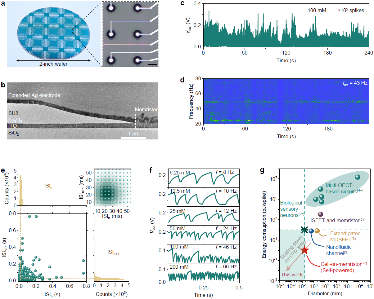 基于CMOS兼容制造工藝,實(shí)現(xiàn)了CoM器件的晶圓級(jí)陣列制備,演示了該領(lǐng)域中首個(gè)高密度化學(xué)感受器陣列系統(tǒng)。陣列中的單器件可以在鹽水溶液的離子刺激下,自發(fā)、原位地產(chǎn)生電壓振蕩信號(hào),其振蕩頻率與離子濃度直接相關(guān)。性能表征測(cè)試表明,陣列上的CoM器件表現(xiàn)出包括亞閾值振蕩、非周期性簇狀放電、全有或無尖峰脈沖以及隨機(jī)振蕩等高階神經(jīng)元?jiǎng)恿W(xué)行為。