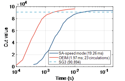 圖2 光電伊辛機(紅線)與模擬退火算法(藍線)求解I4096最大割問題的割值