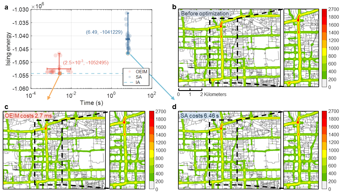 圖3 真實交通多方案優(yōu)化與熱力圖對比。a,光電伊辛機(紅點)與模擬退火算法(藍點)多次求解的計算時間與伊辛能量對比。b-d,優(yōu)化前、光電伊辛機優(yōu)化后(2.7 ms)及模擬退火算法優(yōu)化后(6.46 s)的交通熱力圖。