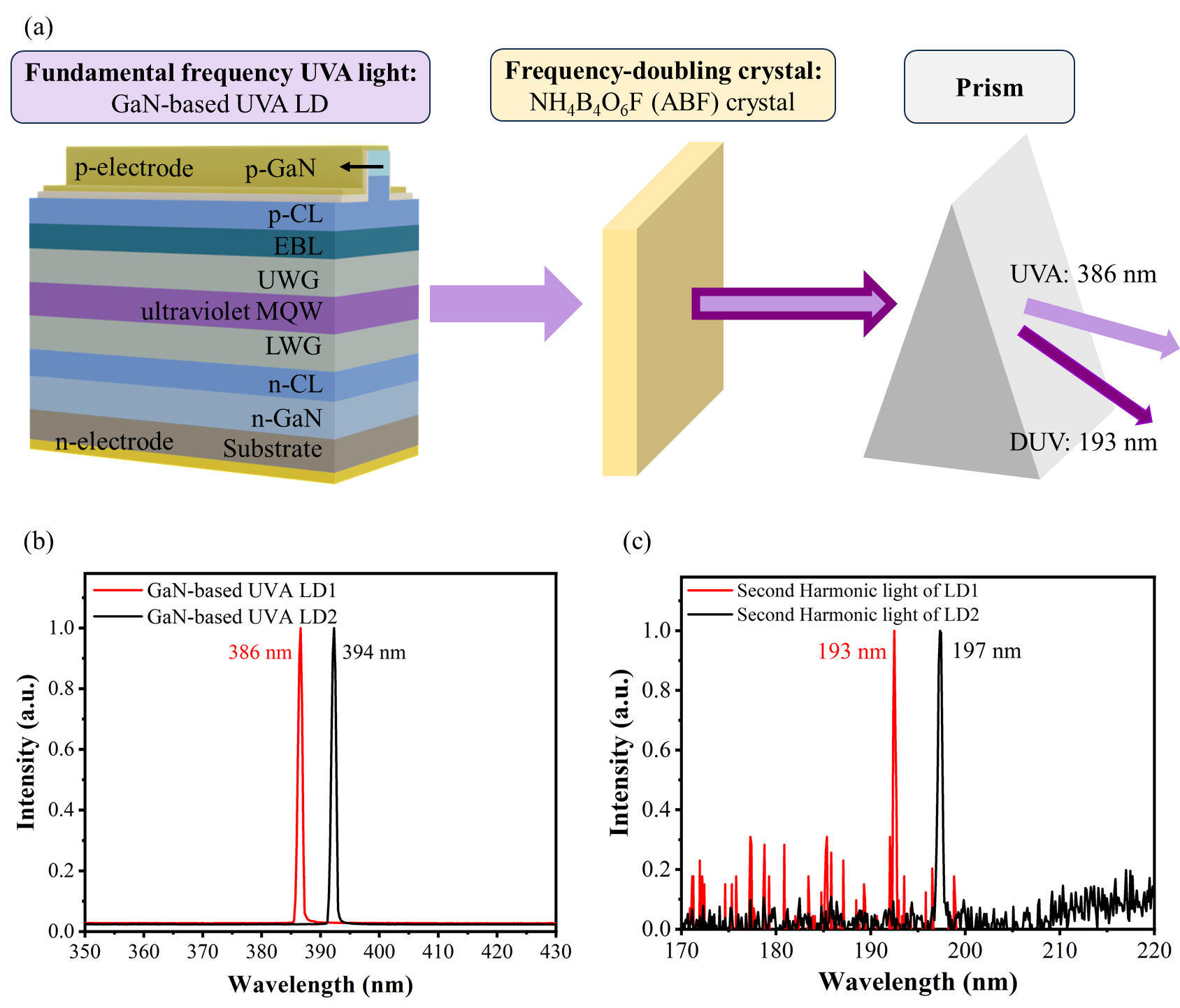 圖1. (a)基于GaN近紫外激光器和ABF深紫外非線性晶體的直接倍頻技術(shù)原理,(b)基頻光源光譜:GaN基386nm和394nm半導體激光器,(c)直接倍頻后獲得的193nm、197nm深紫外激光光譜。?