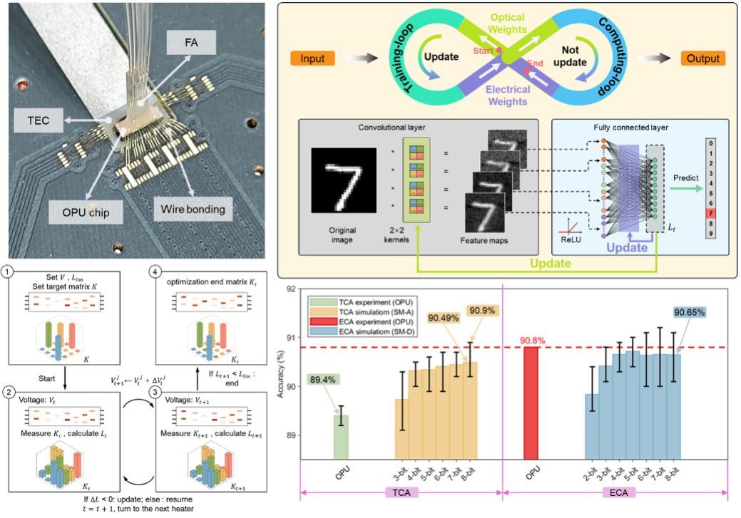 中國(guó)科學(xué)院半導(dǎo)體研究所李明研究員團(tuán)隊(duì)提出了一種基于相位像素陣列的可編程光學(xué)處理單元(OPU),并結(jié)合李雅普諾夫穩(wěn)定性理論實(shí)現(xiàn)了對(duì)OPU的靈活編程。在此基礎(chǔ)上,該團(tuán)隊(duì)構(gòu)建了一種端到端閉環(huán)光電混合計(jì)算架構(gòu)(ECA),通過(guò)硬件—算法協(xié)同設(shè)計(jì),實(shí)現(xiàn)了訓(xùn)練與推理的全流程閉環(huán)優(yōu)化,有效補(bǔ)償了信息熵?fù)p失,打破了光計(jì)算中計(jì)算精度與準(zhǔn)確度之間的強(qiáng)耦合關(guān)系。