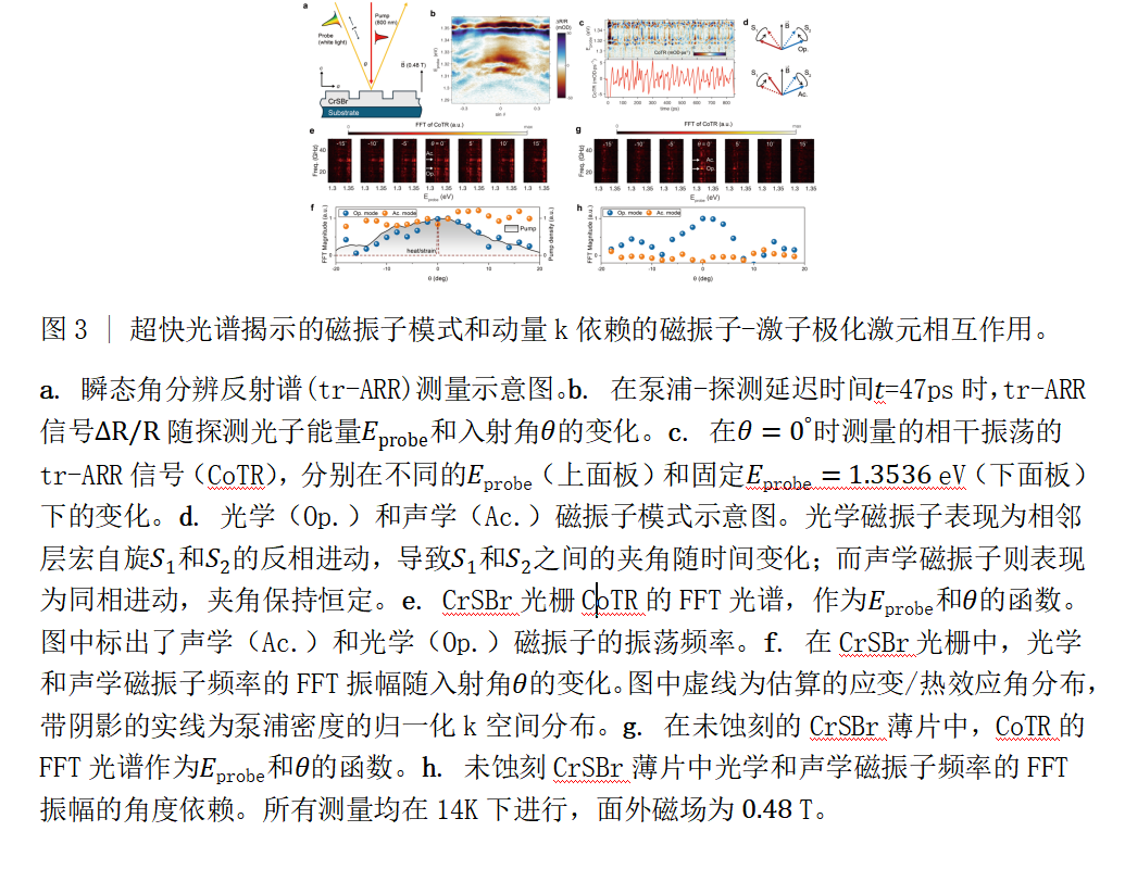 近期,中國科學(xué)院半導(dǎo)體研究所半導(dǎo)體芯片物理與技術(shù)全國重點(diǎn)實(shí)驗(yàn)室王開友研究員、黃雨青研究員及其合作者報道了基于二維磁性半導(dǎo)體CrSBr一維超表面的磁振子-光子界面(圖1a),該CrSBr超表面中承載的連續(xù)體內(nèi)的束縛態(tài)(BICs)與激子發(fā)生強(qiáng)耦合,形成激子極化激元(EP),其能量和輻射特性都可以通過外部磁場進(jìn)行調(diào)控(圖2)。進(jìn)一步通過瞬態(tài)角分辨反射光譜測量,研究發(fā)現(xiàn)相干光學(xué)磁振子能夠?qū)ぷ訕O化激元的能量進(jìn)行超快調(diào)控,且引入了非平凡的動量依賴性,反映了自旋、磁振子與光子之間的協(xié)同耦合行為。相比之下,聲學(xué)磁振子僅表現(xiàn)為局域化調(diào)制信號,未體現(xiàn)出動量相關(guān)的相干耦合特征(圖3)。理論分析表明,這種磁振子模式選擇性來源于CrSBr層間反鐵磁結(jié)構(gòu)中不同磁振子的對稱性差異。
