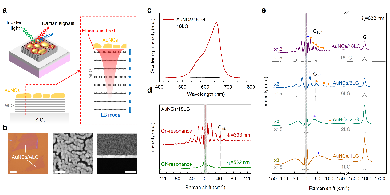 近期,中國科學(xué)院半導(dǎo)體研究所譚平恒研究員團隊聯(lián)合廈門大學(xué)任斌教授團隊報道了等離激元納腔助力二維材料層間呼吸振動探測方面的重要進展。研究團隊提出一種基于金屬納米腔增強層間聲子的普適探測新方法,實現(xiàn)了對多層石墨烯和六方氮化硼等二維材料中難以捕捉的層間振動模式的高靈敏度檢測。其基本原理在于:材料中振動模式的拉曼信號強度受其極化率及入射電場的共同調(diào)控。以多層石墨烯為例,通過在其表面直接沉積納米尺度的島狀金納米腔(圖1a,b),利用該結(jié)構(gòu)對多層石墨烯極化率的有效調(diào)制,以及表面等離激元共振效應(yīng),成功實現(xiàn)了對多層石墨烯層間呼吸模式的顯著增強。掃描隧道顯微鏡和透射電子顯微鏡表征證實,金納米腔以島狀結(jié)構(gòu)均勻分布于石墨烯表面(圖1b)。暗場散射光譜中出現(xiàn)的強共振峰(圖1c),以及在633 nm激光激發(fā)下顯著增強的低頻拉曼信號(圖1d),均表明所制備的金納米腔具有良好的等離激元活性,可作為有效的等離激元增強拉曼光譜媒介。實驗不僅觀測到多層石墨烯中對應(yīng)面內(nèi)振動的G峰,還發(fā)現(xiàn)了一系列隨層數(shù)變化的新低頻模式。這些模式的頻率遠高于已知層間剪切模的最高頻率,證實其來源于多層石墨烯的層間呼吸振動(圖1e)。研究還首次發(fā)現(xiàn)等離激元可調(diào)制振動模式的偏振特性,突破了傳統(tǒng)拉曼選擇定則的限制。
