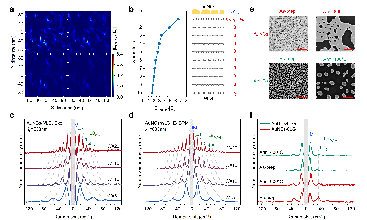該研究進一步構(gòu)建了一個定量理論模型,用于描述層間呼吸模式的增強機制。該模型同時考慮了金納米腔(AuNCs)對石墨烯界面極化率的調(diào)制作用,以及其所產(chǎn)生的強局域等離激元電場。電磁場仿真結(jié)果直觀顯示,金納米腔周圍形成了高度局域化的等離激元電場(圖2a),并有效調(diào)制了界面處石墨烯層的極化率(圖2b)。在此基礎(chǔ)上,通過在傳統(tǒng)層間鍵極化率模型(一種描述二維材料層間振動模式拉曼強度的理論模型)中引入電場和極化率調(diào)制效應(yīng),提出了電場調(diào)制層間鍵極化率模型(E-IBPM)。該模型成功復(fù)現(xiàn)了實驗觀測到的AuNCs/多層石墨烯體系中呼吸模的強度分布規(guī)律(圖2c,2d)。該研究還通過使用不同金屬(如銀納米腔)及不同形貌的納米腔(通過改變退火溫度實現(xiàn),圖2e),驗證了該等離激元增強測量方法具有良好的普適性(圖2f),為拓展其在各類范德華異質(zhì)結(jié)界面表征中的應(yīng)用奠定了基礎(chǔ)。